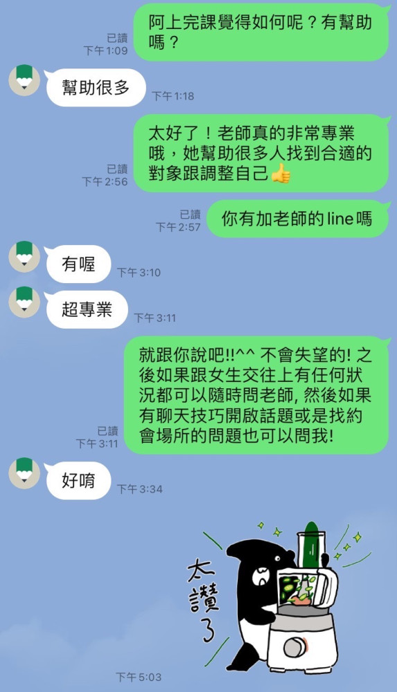 學員的「幫助很多」不是客套話,而是來自對老師專業度的深深信賴。我們深知兩性溝通的細微與複雜,因此提供從技巧開啟到約會實戰的全程諮詢。不只幫你調整自己,更在關鍵時刻給你最中肯的建議。選擇對的引路人,讓幸福不再遙不可及。
