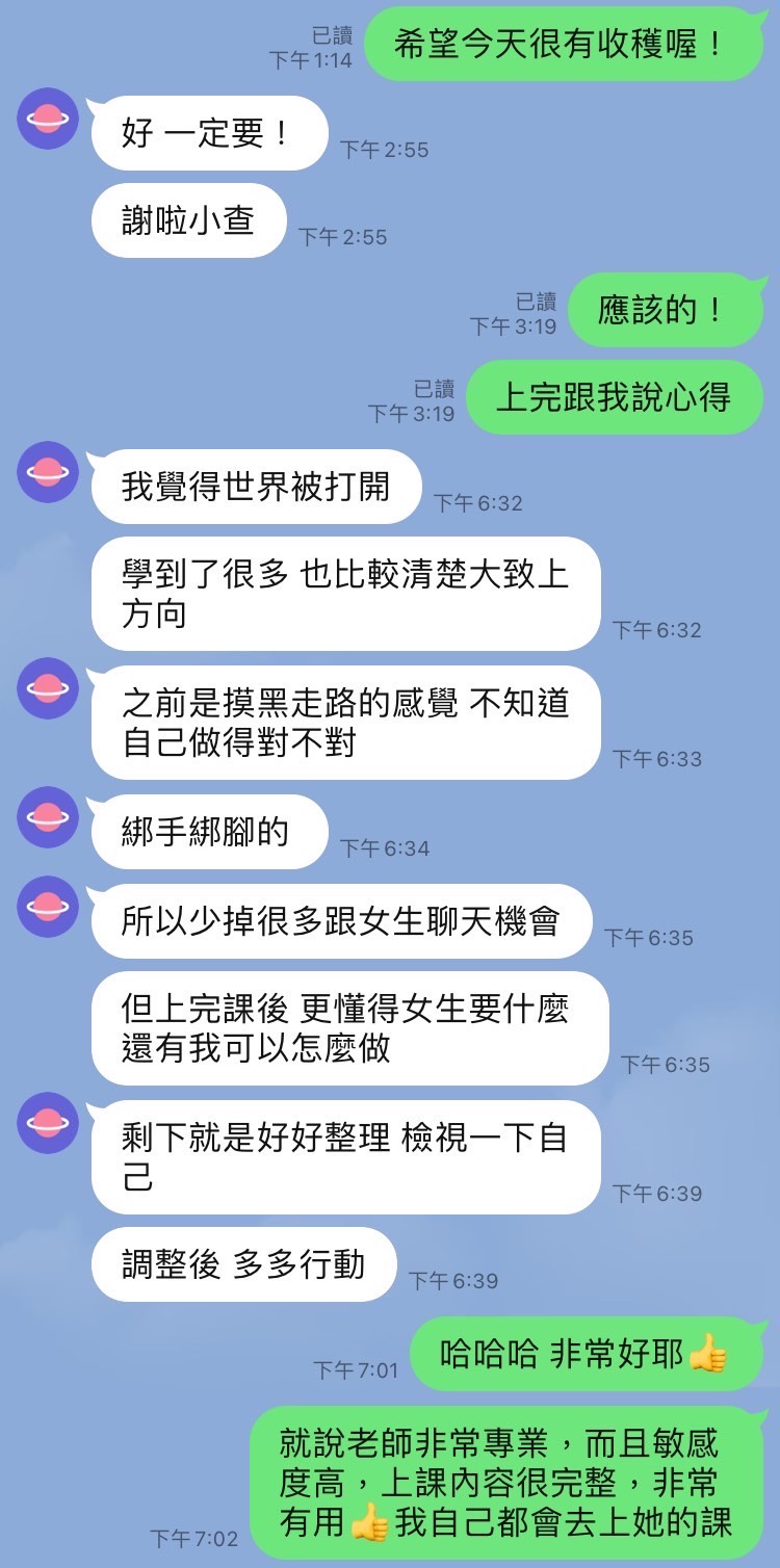 「透過工具的疏理,讓心態學習不再焦慮。」 看到學員從原本的壓力重重,轉變為能從容地面對異性,就是薩提爾模式最強大的力量。在想想交友,我們不教空泛的套路,而是給你實質的覺察工具。從心出發調整狀態,讓你每一場約會都能展現出最真實、最吸引人的一面。